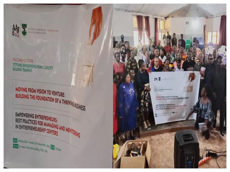 On the 22nd of December 2025 AAJ GLOBAL CONCEPT NIG.LTD. in partnership with UNIVERSITY OF NIGERIA NSUKKA organized a TETFUND ENTREPRENEURSHIP CAPACITY BUILDING ON: MOVING FROM VISSION TO VENTURE: BUILDING THE FOUNDATION OF A THRIVING BUSINESS